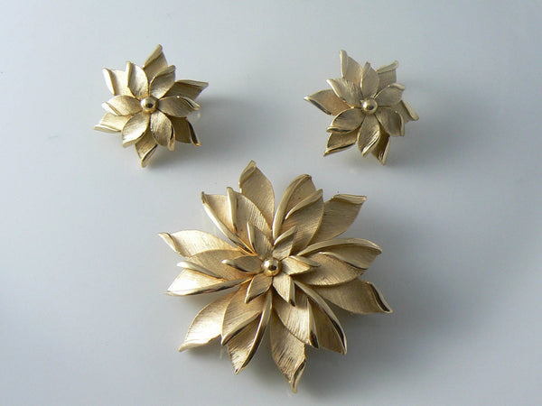 Vintage Crown Trifari Gold Tone Metal Poinsettia Demi Parure