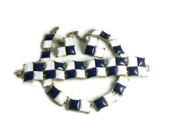 Vintage Kramer of New York Navy Blue and White thermoset Necklace, Bracelet and Clip Earrings