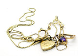 14k Gold Charm Holder Necklace. A 22" inch serpentine chain and a locking charm keeper with an L charm, a heart and key charm, a mini diamond ring, a puffy heart locket with a diamond and the name Lisa engraved on it, a heart outline with a diamond and a heart with a prong-set oval cut amethyst in the center. All charms are 14k and 3 have diamonds and one has a genuine amethyst. Excellent condition. circa 1960's.