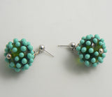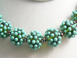14K White Gold Intertwined Signed Turquoise Green Glass Necklace Earring Set. Green glass with raised turquoise enamel dots.The earring posts are marked 14K and have two o's that form a sideways figure 8. The necklace is unmarked. This is a very heavy high quality set. They have green glass with raised turquoise dots. The beads are large 20mm. The necklace measures 17" in length.