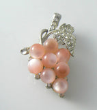 This 1940's pin depicts a bunch of grapes in luminous pink Lucite Moon glow beads with a stem and leaf pave' set with crystal rhinestones. The pin is 2 1/8" high and 1 5/8" wide. The metal is silver-tone. The safety clasp pin is securely soldered to the back. Very good condition.