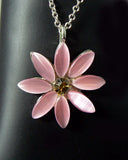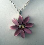 A genuine 1970's necklace with a silver tone chain and flower pendant that has pink mother of pearl petals on a silver base. It has a large Swarovski crystal in the center. Measures 46cm. Excellent condition.