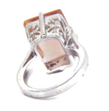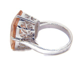 9ct simulated peach morganite gemstone ring. Set in sterling silver. This is a flawless high quality lab created peach gemstone is 16mm (5/8th of an inch) by 12mm (1/2 inch) in size. The bright peach colored gemstone has great color and shine. excellent condition. Size 6 1/2.