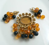 Alice Caviness Dangling Amber, Black Bead Rhinestone Demi Parure. Dangling black and amber orange Lucite beads with matching colored rhinestones. Set in gold tone metal. The pin is signed Alice Caviness, the clip earrings are unsigned. The pin measures 3 1/2" and the earrings dangle nearly 2 1/2". There are some spots in the large rhinestone on the pin otherwise excellent condition. Great Halloween set. circa 1960's.
