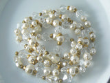 Glass baroque pearl necklace is impressively long at almost 60" long. Can be worn in a long single layer and anything in between. It has gold tone spacer beads and clear acrylic beads. The piece is signed "Miriam Haskell" and is in wonderful condition.