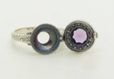 Amethyst and pearl Sterling Silver Poison Pill Box Ring. Marked 925. The face measures 14mm in diameter. Size 8. The ring is in excellent condition but would not be functional to put much in, as you can see in the last picture the back is not solid.