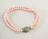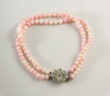 Angel Skin Coral 2 Strand Bracelet. Vintage silver tone rhinestone box clasp. The beads are 4mm. The beads have some minor inclusions and surface scratches as is the case in natural coral. Measures 7 1/2" including the clasp.