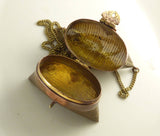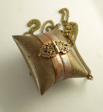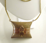 Antique Pillow Purse Edwardian Locket. The large locket is hinged to open and close. These purse lockets or necklaces were used as keepsakes or memento holders during the early 19th century. The chain and locket look like brass and are slightly tarnished. Measures 38" in length and the purse measures 2 1/2" by 2 1/2" by 1 1/2". Very good condition with slight tarnish. This has not been polished.