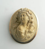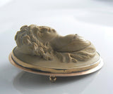 Antique Carved Lava Cameo 14k Rose Gold. Antique lava cameo, hand carved in high relief to depict a beautiful classical woman. Circa 1860. Appraised at $375. Measures almost 2" by 1 3/4" and 3/4" deep (47 x 39 mm and 17 mm deep). Excellent condition with the exception of a small chip on her nose.