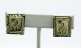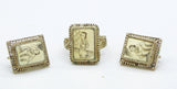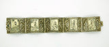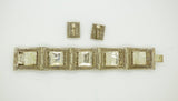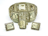 Antique Chinese Export Bovine Water Buffalo Carved Bone 900 Silver Filigree Hand-painted Scrimshaw Set. Bracelet, screwback earrings and adjustable ring. The bracelet is stamped CHINA. and measures 6 3/4" in length by 1 1/8" wide. not including the clasp. The earrings and ring are 3/4" tall. Very good vintage condition. circa 1930's.