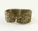 This an intricate and impressive silver bracelet that dates from the early 1900's. It has 4 hand painted panels depicting Chinese warriors. Hand woven filigree 800 silver with gold gilt floral and leaf design. The clasp is a repair, as shown in the last picture, it is secure. Measures 7" by 1 1/4".