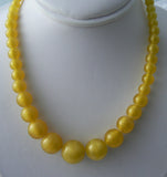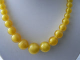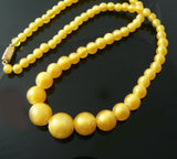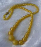 Antique Czech Glass Lamp Worked Satin Yellow Beads Necklace.This unique necklace originates from Jablonec and the Nisou area, first third of last century. It´s made of graduated satin yellow round Czech glass lamp worked beads - every bead was handmade. The biggest bead measures 1/2". The necklace is strung on cotton thread and ends with rectangular closure in golden color. Measures 17". circa 1940's.