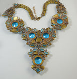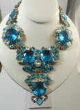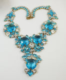Aqua Blue and Clear Czech Glass Statement Necklace, Rhinestone. Set in non-plated brass. The round blue stones are open back, all stones are prong set.This is a large necklace, the round blue stones are 24" in diameter. Measures 20" in length including the 3" extension chain. Excellent condition.