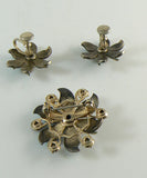 Aqua Blue Guilloche Rhinestone Floral Demi Parure. This has with blue accent rhinestones. Set in silver tone metal. Brooch has a diameter of 1 1/4" and the screw type earrings are 7/8". Very good condition. circa 1950's.