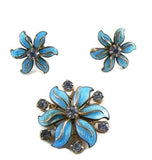 • Aqua Blue Guilloche Rhinestone Floral Demi Parure - Vintage Lane Jewelry