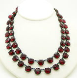 Art Deco 2 Strand Ruby Red Round Cut Crystal Open Back Necklace. Set in black japanned metal. Measures 20" in length. Each crystal is 12 mm in diameter. Excellent condition. circa 1940's.