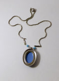 Art Deco Blue Enamel and Molded Glass Flower Necklace. Set in silver tone metal. This has pertinently blue molded glass flower pendant. Secure push clasp. The necklace measures 18" in length; the pendant measures 1 1/8" by 1 1/2". circa 1940's.
