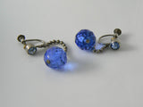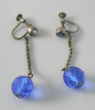 Art Deco Blue Glass Stone Dangle Earrings. Silver brass colored metal with age darkening. Blue glass bezel set stone tops with faceted glass drop dangles. Screw-back. Measures 2" long - faceted blue drop measures about 11mm. Condition: Good working condition - age wear from silver to brass. Age wear and small chips to the glass dangles.