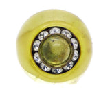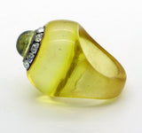 Art Deco Carved Prystal Bakelite Ring with Rhinestones and Glass Cabochon. The ring is an apple juice yellow color with a bezel-set circle of clear rhinestones accented with a yellow glass cabochon at the center. It is approximately a size 5. The overall condition of the ring is very good with some age to the stone cabochon and tarnish to the metal. circa 1940's.