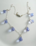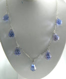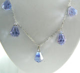 This is a beautiful vintage Art Deco Czech glass drop necklace in a gorgeous shade of lavender blue. The color is very subtle and the faceted drops are very bright. There are seven Briolette drops suspended from a delicate sterling silver chain. The chain is unmarked but tests positive for sterling. Measures 16" long and it is in very nice condition. I see some very tiny fleabites on some of the facets of the drops, but nothing that distracts from the beauty of the necklace.