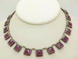 Art Deco Open Back Crystal Amethyst Purple Glass Necklace. This has square cut purple amethyst glass crystals dating from about the 1930's. The necklace is a silver plated metal with 21 prong set open back, square cut amethyst purple crystals. The crystals measure approximately 12mm by 12mm each. The overall length of the necklace is approximately 15 1/2" and the width about 1/2". The overall condition is very good with normal age. circa 1940's.