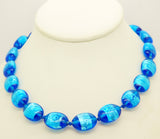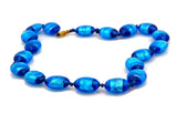 Art Deco Peacock Blue Foil Art Glass Necklace. Beautiful vibrant bright blue art glass foiled beads. Measures 17" in length and the beads are 18mm by 14mm. Hand knotted between each bead with blue string. Secure barrel clasp. Excellent condition. circa 1950's.