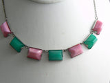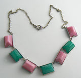 Art Deco Pink Green Chryosprase Glass Sugarloaf Silver Necklace
