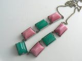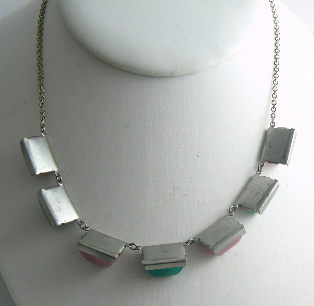 Art Deco Pink Green Chryosprase Glass Sugarloaf Silver Necklace. This necklace is unique for the color combination of the glass and the thick sugarloaf shape that juts out from your neckline when worn. Each glass cab is 5/8" at its widest point and is 3/8" thick at its thickest point. The pendants at flat at the back so the piece lays very flush at the back. There is a crack and a chip to the corner of one of the glass cabochons but the glass cab still seems firm and it is noticeable only on close inspection due to the location of the chip. There are no other chips or cracks to the glass and the surfaces are smooth and gleaming. The silvertone is bright with little darkening or discoloration. Overall this is a colorful and uniquely designed, Art Deco glass necklace that is in very good condition.