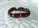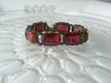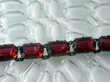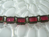 Art Deco Open Back Ruby Red Glass Bracelet. It consists of large faceted glass stones in metal mountings. The condition is great and the color sensational. It has a German patent mark GES.GESCH 74599 Measures 7" long x 1/2" wide. Excellent condition.