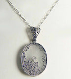 Art Deco Sterling Silver Filigree Camphor Glass Diamond Necklace. Marked sterling. Genuine Diamond center. The camphor glass measures 1" by 3/4". The paper clip measures 18" in length. circa 1940's.