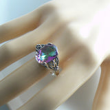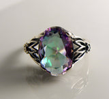 Art Nouveau Revival Sterling Silver Mystic Topaz Filigree Ring. It is hallmarked 925. The Flawless oval full cut high quality lab mystic topaz is 14mm (9/16th of an inch) by 10mm (3/8 inch) in dimension. This mystic topaz has superb colors (pinks, purples, greens, blues, yellows... etc) and breathtaking clarity. Size 8 1/2.