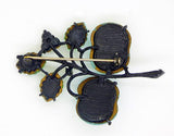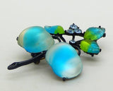 Austria Double Cherries Aqua Blue and Frosted White Glass Fruit Brooch. Set in japanned black metal. This has aqua blue and green glass leaves. Unsigned. Measures 2 1/2" long. Very good vintage condition. circa 1950's.