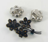 Austria Signed White Frosted Glass and Turquoise stone Japanned Flower Brooch, Clip Earrings. This is a married pair. The earrings are clip and unsigned Weiss. The pin is 2 5/8" tall and almost 1 7/8" at the widest point. The earrings have secure clips measuring 1 1/8" and 1/4" high. These are in great condition with all prong set, present and pretty stones with little signs of age or wear. circa 1950's.