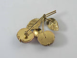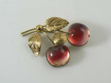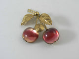 Austrian Crystal Double Pink Cherry Fruit Pin Brooch. Set in gold tone metal. Signed Austria. Measures 2" by 1 3/4". Very good condition with a couple nibbles on the edges of the cherries.