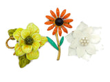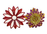 Autumn Colors Enamel Flower Lot 8 flowers, clip earrings. The largest pin measures 3 1/2" in diameter. Some pins have been repainted or touched up.. All in very good vintage condition