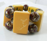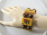 Will fit a 7" to 7 1/2" wrist and has double strong elastic. Honey butter Bakelite 1940's tiles, Made and signed by Jan Carlin. Excellent condition. circa 1950's.