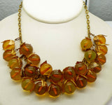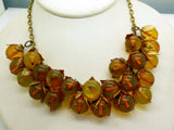 Bakelite Beaded Brass Leaf Necklace. This has 15mm translucent amber Bakelite beads with brass leaf bead caps. Matching brass loop chain. Measures 16" in length with a secure jump ring clasp. Simichrome tested. Excellent condition. circa 1950's.