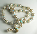 Baroque Glass Pearl and Aqua Glass Bead Miriam Haskell Necklace. This has aqua blue turquoise glass spacer beads and gold bead caps. The extension chain has pearls alternating with blue glass beads. Classic Miriam Haskell Flower clasp. Signed in the clasp. Measures 25" including clasp and extension. The pearls are 10mm. The pearls have slight wear, not noticeable when wearing.