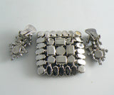 This beautiful vintage pin and clip earring set are possibly a married set but coordinate together wonderfully! They are silver tone with baby blue rhinestones. The pin is 2" and the earrings are 1 1/2". Excellent condition. circa 1960's.