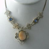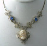 Beautiful old silver filigree, carved shell cameo necklace. This has the look of silver and may have silver content but I do not believe it is sterling. The chain looks like it was once silver plated but is almost solid brass. The filigree setting has some wear but is still nice. It measures 18 1/4" long with a tension hook type clasp. The center design is almost 5" across and over 1 3/8" long. The cameo is fine as are the blue glass stones.Very pretty on, wonderful condition.