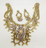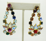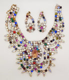 Bijoux M.G. Czech Glass Fall Colors and Opal White Stones Statement Necklace and Pierced Style Earring Set. Set in non-plated brass. Signed Bijoux M.G. White opal round faceted glass rhinestones. The necklace measures 15" with a 3" extension chain. The earrings are 2 1/2" by 1" Very good condition. circa 1960's.