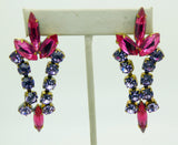 Bijoux M.G. Czech Glass Lavender Rhinestone Pink Navettes Statement Necklace and Pierced Style Earring Set. Set in non-plated brass. Signed Bijoux M.G. Lavender round faceted glass rhinestones with a pink glass navettes. The necklace measures 15" including the 3" extension chain. The center drop is 5". The earrings are 2 1/2" by 3/4" Very good condition.