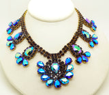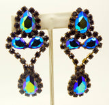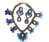 Bijoux MG Black Borealis Czech Glass Rhinestone Necklace and Clip Earrings. Set in non-plated brass. Unsigned Bijoux MG. This has black AB faceted pear shaped stones that flash blue. Surrounded by black round faceted rhinestones. Measures 15" in length with an 3" extension chain. The clip earrings measure 3" by 1 1/4" Very good vintage condition.