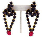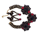 Bijoux MG Czech Black Stone Choker and Earrings. Set in non-plated brass. Signed Bijoux MG. This has black glass rhinestones and is accented with blood red oval faceted stones. The earrings are for pierced ears. The choker measures 12" (30.48 cm) and has a 3 1/2" (8.89 cm) extension chain. The earrings measure 3" (7.62 cm) by 1 1/2" (3.81 cm). Excellent vintage condition. circa 1960's.