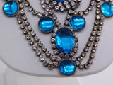 Bijoux MG Czech Glass Blue Rhinestone Statement Necklace and Earrings. Set in non-plated brass. Signed Bijoux MG. The necklace measures 14" in length with a 4" extension chain. The post earrings measure 3" by 1". Very good vintage condition.
