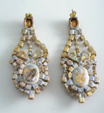 Bijoux MG Pink Czech Glass Pierced Style Earrings set in non-plated brass. 2 oval amethyst stones, round cut pink rhinestones surrounding 3 large frosted AB stones. Measure 3" in length. Very good condition.