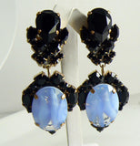 Black and Robins Eggs Blue Czech Glass Clip Earrings. Set in non-plated brass. These have a large robins egg blue givre glass stone surrounded by Czech Glass rhinestones. Measures 2 1/4" by 1" Excellent condition.