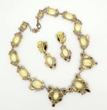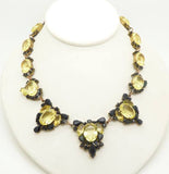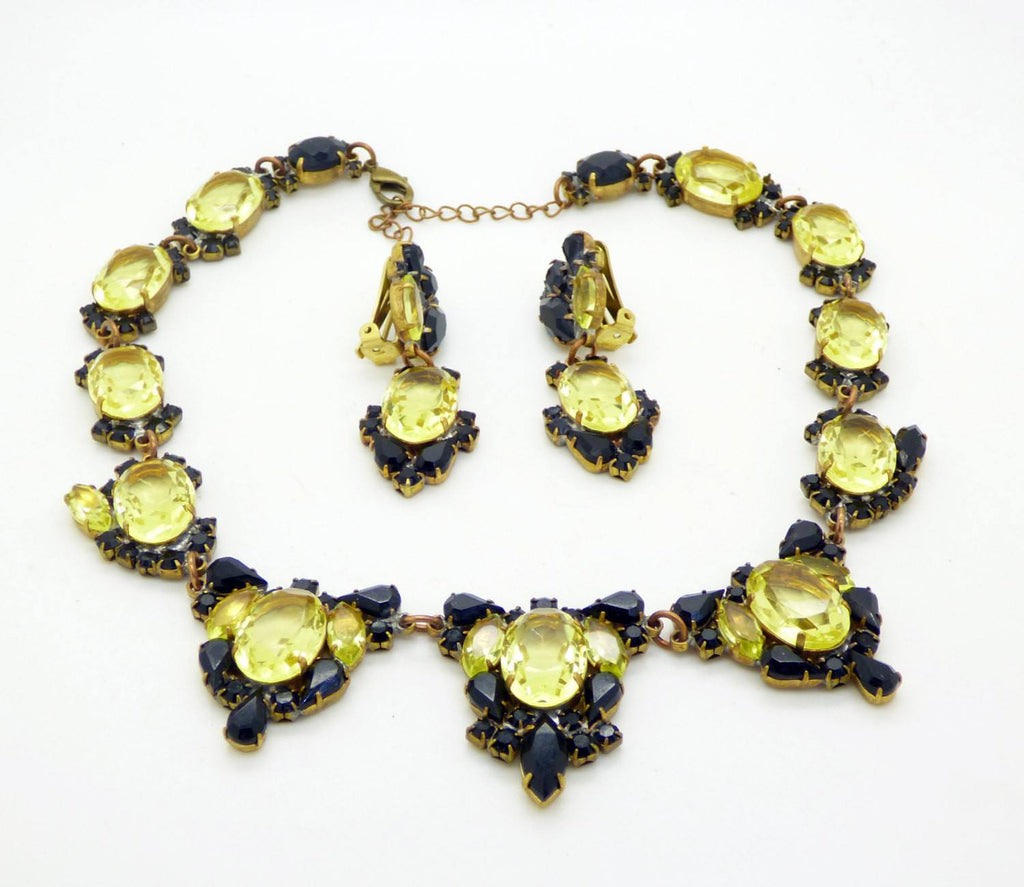 Black and Yellow Czech Glass Necklace, Clip Earring Set. This has opaque black glass stones and golden yellow glass stones. Set in non-plated brass. Measures 18" in length including the chain extension. The matching clip earrings measure 2" Very good vintage condition.