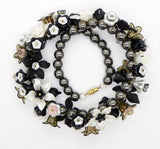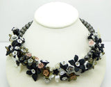 Black Obsidian Beaded Lucite Flower Necklace. This has 10mm obsidian beads and black, silver and white Lucite flowers. It also has silver, black and rose colored glass flower beads. Measures 17" in length with a secure barrel clasp. It is a heavy necklace. Excellent condition.