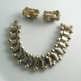 Blue Confetti Glass Bead Faux Pearl Bracelet and Earrings. Set in gold tone metal.Robins egg blue and copper glass confetti cabs with imitation pearls. Measures 7" in length by 3/4" wide. The clip earrings are 1" by 1/2" Excellent condition.